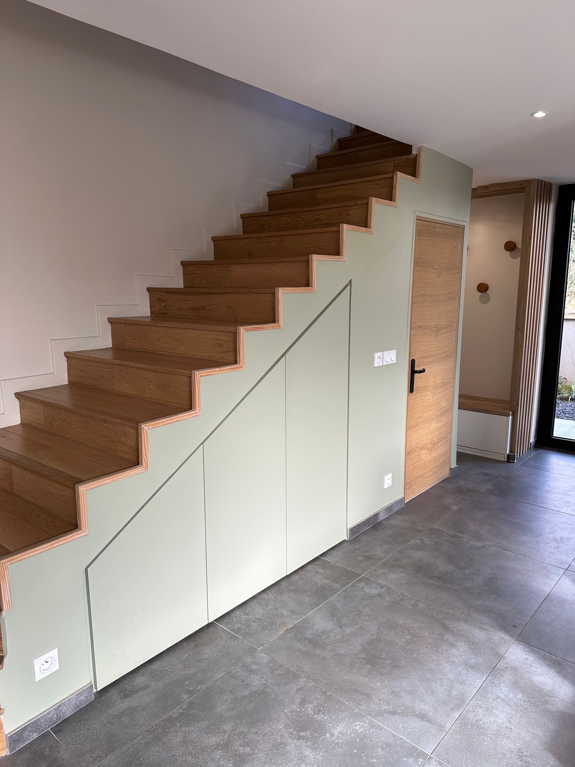 Pour exploiter pleinement les espaces sous des escaliers, envisagez le sur-mesure. Personnalisez l'espace en intégrant des penderies, et un espace dédié aux chaussures pour un accès facile. Vous pouvez également inclure des tiroirs pratique pour le rangement discret, ainsi que des compartiments spéciaux pour les produits ménagers.
